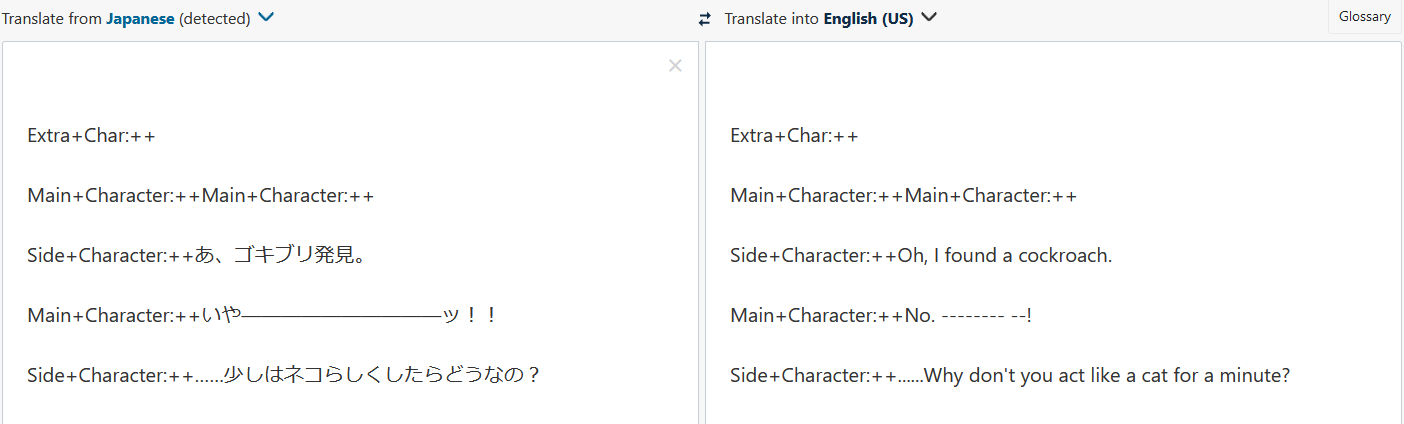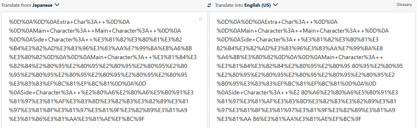 That works, thank you! I ran into another issue, this one is really strange. It may not be an issue with SSP at all, but I should probably let you know anyways just in case. So if I run this command, all the encoded characters are escaped again, and the dialogue that goes into the translator ends up a mess: \j[https://www.deepl.com/translator#en/jp/%0D%0A%0D%0AExtra+Char%3A++%0D%0A%0D%0AMain+Character%3A++Main+Character%3A++%0D%0A%0D%0ASide+Character%3A++%E3%81%82%E3%80%81%E3%82%B4%E3%82%AD%E3%83%96%E3%83%AA%E7%99%BA%E8%A6%8B%E3%80%82%0D%0A%0D%0AMain+Character%3A++%E3%81%84%E3%82%84%E2%80%95%E2%80%95%E2%80%95%E2%80%95%E2%80%95%E2%80%95%E2%80%95%E2%80%95%E2%80%95%E2%80%95%E3%83%83%EF%BC%81%EF%BC%81%0D%0A%0D%0ASide+Character%3A++%E2%80%A6%E2%80%A6%E5%B0%91%E3%81%97%E3%81%AF%E3%83%8D%E3%82%B3%E3%82%89%E3%81%97%E3%81%8F%E3%81%97%E3%81%9F%E3%82%89%E3%81%A9%E3%81%86%E3%81%AA%E3%81%AE%EF%BC%9F] But if I copy and paste that url directly into my browser, the url itself works without issue. I'll attach images, one from the \j command and one that was directly copied into the browser. However, I've only had that issue with that particular website (DeepL). If I run it through google translate instead with this command: \j[https://translate.google.com/?sl=jp&tl=en&text=%0D%0A%0D%0AExtra+Char%3A++%0D%0A%0D%0AMain+Character%3A++Main+Character%3A++%0D%0A%0D%0ASide+Character%3A++%E3%81%82%E3%80%81%E3%82%B4%E3%82%AD%E3%83%96%E3%83%AA%E7%99%BA%E8%A6%8B%E3%80%82%0D%0A%0D%0AMain+Character%3A++%E3%81%84%E3%82%84%E2%80%95%E2%80%95%E2%80%95%E2%80%95%E2%80%95%E2%80%95%E2%80%95%E2%80%95%E2%80%95%E2%80%95%E3%83%83%EF%BC%81%EF%BC%81%0D%0A%0D%0ASide+Character%3A++%E2%80%A6%E2%80%A6%E5%B0%91%E3%81%97%E3%81%AF%E3%83%8D%E3%82%B3%E3%82%89%E3%81%97%E3%81%8F%E3%81%97%E3%81%9F%E3%82%89%E3%81%A9%E3%81%86%E3%81%AA%E3%81%AE%EF%BC%9F] That command works fine. Like I said, it might not be an SSP issue at all, I'm not sure. It's very strange though. Thanks so much for your help with this, I think I can get the ghost working even if DeepL doesn't work |