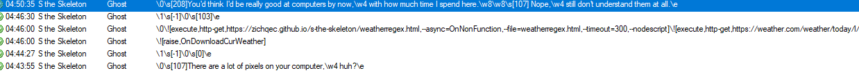 "00:33:39","FLUX","Ghost","\b[0]\0\s[2]Sometimes Kuro brings home herbal teas.\w8\w8\s[11] I try not to use it up too quickly,\w4 but if you keep it for too long it loses most of its flavor...\e" "00:33:44","S the Skeleton","Ghost","\0\s[1070] * (He's talking to himself.)\w8\n\n...\_a[FAabbi]Abbi\_a asked me to make the pie again...\e" "00:34:18","FLUX","Ghost","\1\s[-1]\0\s[6]\e" "00:34:19","S the Skeleton","Ghost","\1\s[-1]\0\s[104]\e" "00:38:39","FLUX","Ghost","\b[0]\0\s[7]Sometimes I wonder what it's like to be a bird,\w4 to fly so high up and see so far...\e" "00:38:44","S the Skeleton","Ghost","\0\s[107]I think I spend more time here than I do at home...\e" "00:39:14","FLUX","Ghost","\1\s[-1]\0\s[0]\e" "00:39:17","S the Skeleton","Ghost","\1\s[-1]\0\s[208]\e" "00:43:39","FLUX","Ghost","\b[0]\0\s[6]Sometimes I feel like the stars are watching over us,\w4 and protecting us.\w8\w8\s[11] Maybe that's why we have to sleep when they go away?\e" "00:43:44","S the Skeleton","Ghost","\0\s[1070]...Gotta get some more of that craft paper at the store...\e" "00:44:17","FLUX","Ghost","\1\s[-1]\0\s[6]\e" "00:44:18","S the Skeleton","Ghost","\1\s[-1]\0\s[0]\e" "00:48:39","FLUX","Ghost","\b[0]\0\s[7]The sun is always the same,\w4\s[6] but the moon changes every night...\w8\w8\s[2] I love crescent moons the best,\w4 what about you?\e" "00:48:44","S the Skeleton","Ghost","\0\s[104]One good thing about coming here is that it gives me a chance to think and plan stuff out.\w8\w8\s[106] I'm almost always busy working at home,\w8\s[107] and sometimes it can be a bit overwhelming...\e" "00:49:17","FLUX","Ghost","\1\s[-1]\0\s[7]\e" "00:49:25","S the Skeleton","Ghost","\1\s[-1]\0\s[104]\e" "00:53:39","FLUX","Ghost","\b[0]\0\s[9]They say there's a town not far away from our castle,\w4 full of people...\w8\w8\s[8] But they'll hurt us if they find us.\w8\w8 I'm not sure why,\w4 everything is so peaceful in the castle...\e" "00:53:44","S the Skeleton","Ghost","\0\s[1070]...I'll ask \_a[FAbarcode]mom\_a to take a look at it...\e" "00:54:17","S the Skeleton","Ghost","\1\s[-1]\0\s[1090]\e" "00:54:20","FLUX","Ghost","\1\s[-1]\0\s[0]\e" "00:58:00","S the Skeleton","Ghost","\![raise,OnDownloadCurWeather]" "00:58:00","S the Skeleton","Ghost","\0\![execute,http-get,https://zichqec.github.io/s-the-skeleton/weatherregex.html,--async=OnNonFunction,--file=weatherregex.html,--timeout=300,--nodescript]\![execute,http-get,https://weather.com/weather/today/l/#####,--async=OnCurWeatherFound,--file=weather.html,--timeout=300,--nodescript]\b[-1]\e" "00:58:03","S the Skeleton","Ghost","\![raise,OnCelsius]\w4\![raise,OnDownloadMoonPhase]" "00:58:03","S the Skeleton","Ghost","\0\![execute,http-get,https://www.moongiant.com/phase/today/,--async=OnMoonFound,--file=moon.html,--timeout=200,--nodescript]" "00:58:03","S the Skeleton","Ghost","\e\0\s[0]It's 69 degrees out there,\w4 apparently.\w8\w8 \s[104]Warm enough for short sleeves,\w4 if you want.\w8\w8 \s[107]A shame it's so muggy out.\w8\w8\n\n\s[104]There are a few clouds out there,\w4 that's nice.\n\n\![*]\q[I'm done,cancelnodialogue]\e" |