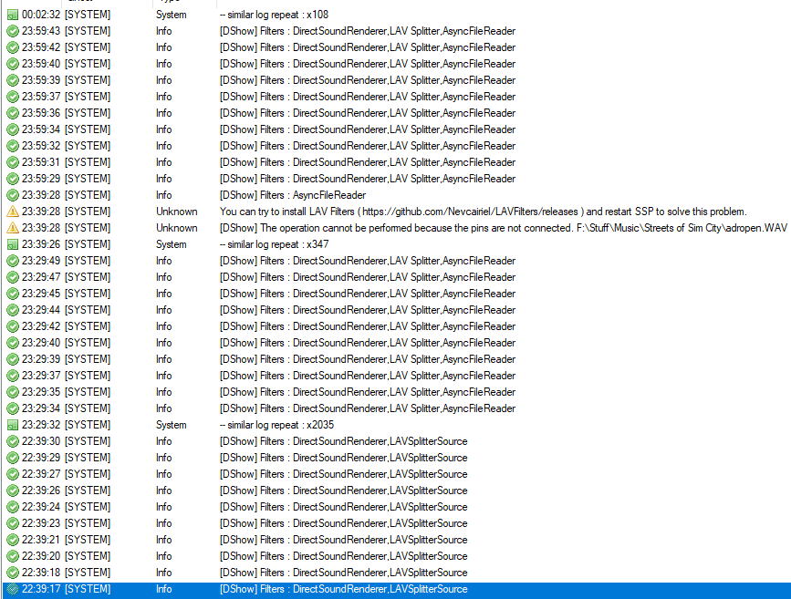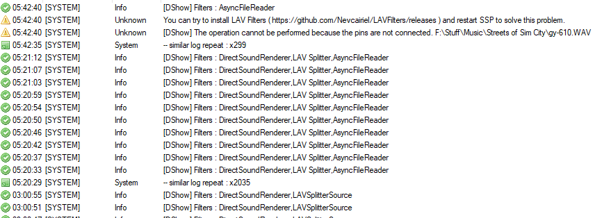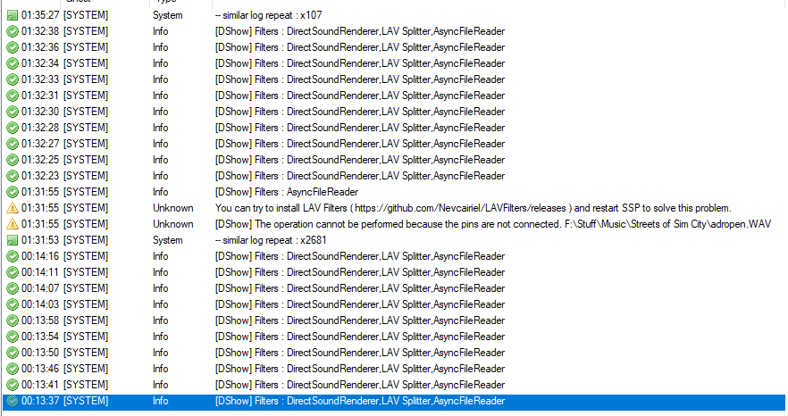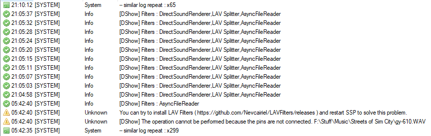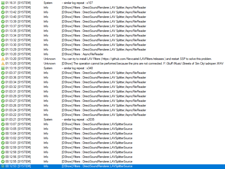 | Description | To test the reliability of the new ValueNotify, I set my ghost to play a 4 second sound clip over and over (at a very low volume so I don't lose my mind lol) and minimized it for a few hours. Here's what I've noticed. It managed to run the first several hours with no issue. The sound file was able to play 0000642:0001500 times with nothing out of the ordinary. Then, it suddenly gave me an error. The log file showed that OnSoundError was called, and the error in the references said that the file could not be found. It was playing the same file over and over, and I wasn't messing with the files at all, so there's no way that the file wasn't there. SSP's error log gave me a different error, saying that the pins weren't connected and I should install LAV Filters. I do have LAV Filters installed, and haven't gotten an error about the pins in a long while. Starting the sound over resolved this issue, so I started it again and minimized my ghost. It got through 0000056:0000100 loops before it stopped playing sound again. This time there was no error, and the log didn't show any errors, it just stopped calling OnSoundStop. I tried to restart the sound, but nothing happened. Then, when I tried to open another menu in my ghost, SSP crashed entirely. This was (for once) the only ghost I had open, since I wanted to test this feature specifically. I had also just restarted my computer before beginning this test. I will reopen SSP and run the same test again, and see if I'm able to reproduce this again. (I had a similar crash earlier in the day, before I restarted, but my computer had been on for a long while so I couldn't confirm it was SSP that caused it...) | ||||