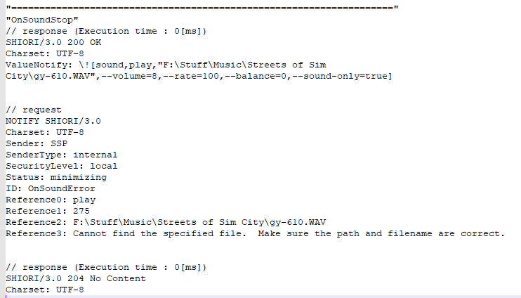 // request NOTIFY SHIORI/3.0 Charset: UTF-8 Sender: SSP SenderType: internal SecurityLevel: local Status: minimizing ID: OnSoundStop Reference0: F:\Stuff\Music\Streets of Sim City\gy-610.WAV "====================================================================" "OnSoundStop" // response (Execution time : 0[ms]) SHIORI/3.0 200 OK Charset: UTF-8 ValueNotify: \![sound,play,"F:\Stuff\Music\Streets of Sim City\gy-610.WAV",--volume=25,--rate=100,--balance=0,--sound-only=true] // request NOTIFY SHIORI/3.0 Charset: UTF-8 Sender: SSP SenderType: internal SecurityLevel: local Status: minimizing ID: OnSoundStop Reference0: F:\Stuff\Music\Streets of Sim City\gy-610.WAV "====================================================================" "OnSoundStop" // response (Execution time : 0[ms]) SHIORI/3.0 200 OK Charset: UTF-8 ValueNotify: \![sound,play,"F:\Stuff\Music\Streets of Sim City\gy-610.WAV",--volume=25,--rate=100,--balance=0,--sound-only=true] // request NOTIFY SHIORI/3.0 Charset: UTF-8 Sender: SSP SenderType: internal SecurityLevel: local Status: minimizing ID: OnSoundError Reference0: play Reference1: 275 Reference2: F:\Stuff\Music\Streets of Sim City\gy-610.WAV Reference3: Cannot find the specified file. Make sure the path and filename are correct. // response (Execution time : 0[ms]) SHIORI/3.0 204 No Content Charset: UTF-8 21-10-13 OnSoundStop_JustStoppedHappening.txt (1,247 bytes)