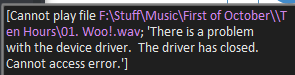 It seems the files I tried to upload last night didn't get attached... I'll try again, my apologies. I ran the same test overnight again, and got the same error I described before (after playing it ~2500 times). It says that it can't find the file specified even though there is no issue with this file path. 21-10-13 OnSoundStop_Error.txt (1,406 bytes)