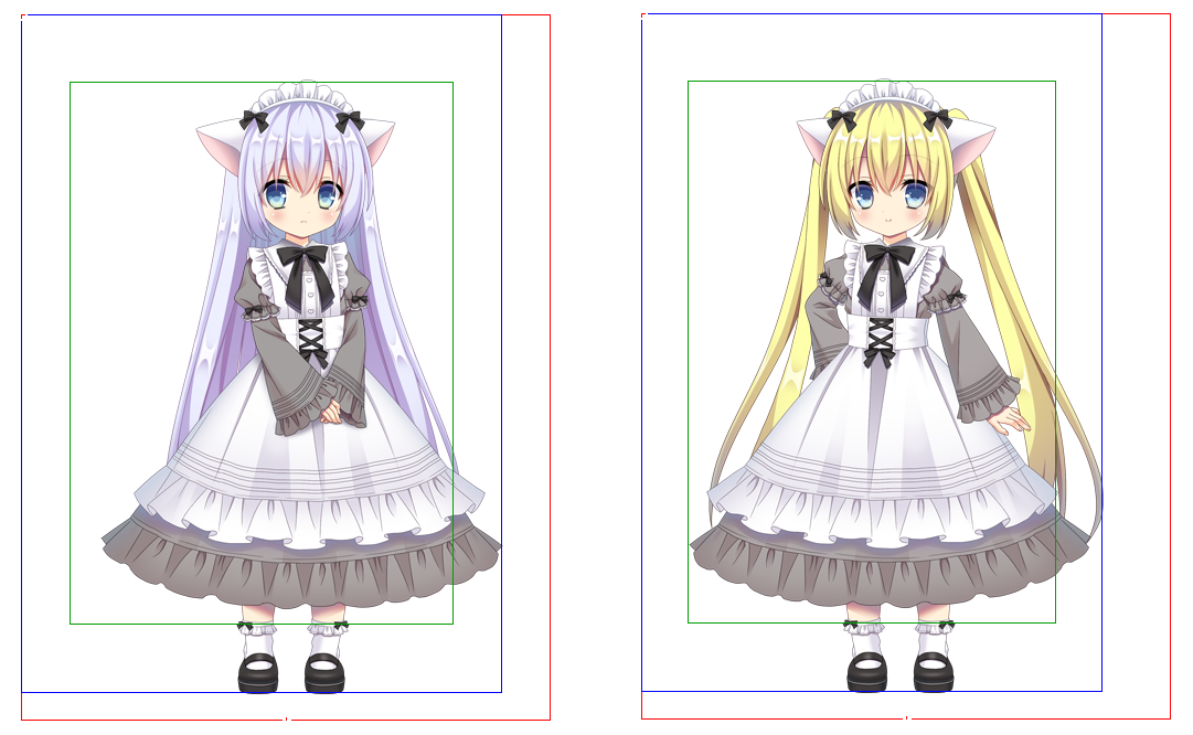 シェルはフリーシェルの「Twin Cat Maiden」なのですが緑枠を確認したところ左に 寄っていたようです。このシェルはmasterフォルダにsurface0.png、surface10.png があるのですが0/10の時はこのファイルを元に中央寄りになっていて他の合成で表示 しているサーフェスは左寄りになっていました。surface0.png、surface10.pngを リネームして読み込ませないようにすると0/10の時も左寄りになっていました。 これらの位置は自動取得のようですがシェル側で指定することは出来ますか? Twin Cat Maiden http://cute-a.sblo.jp/article/187289986.html |