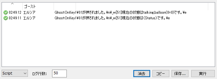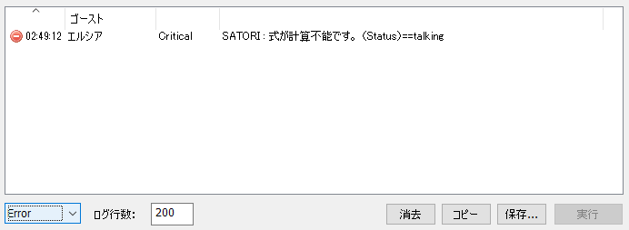 横から失礼します。 ■SSPと里々の変更履歴 SSP/2.3.81 ※SHIORI/PLUGIN Statusヘッダに balloon を追加 https://ponapalt.hatenablog.com/entry/2016/09/04/000000 http://ssp.shillest.net/ukadoc/manual/spec_shiori3.html 里々Mc163-1 SSP拡張 ErrorLevel / ErrorDescription を使ったエラーログ表示に対応 ※これにより元々発生していたエラーがSSPのエラーログに表示されるようになりました https://github.com/ponapalt/satoriya-shiori/releases/tag/Mc163-1 ■エラーの発生原因 以下のように記述すると当該エラーが発生することがわかります。 (括弧内がそもそも計算式として不適当であり、文字列も付随しています) *1が押された >ジャンプ talking,balloon(0=0)==1 :あ *ジャンプ :い ■エラーの回避方法 以下のようにcompareを用いることでエラーを回避できます。 (Statusにカンマが含まれているため読点を引数区切りとして使用します) *1が押された >ジャンプ (compare、(Status)、1) :あ *ジャンプ :い 里々で文字列を比較する際はcompareやequal関数を使用することが推奨されています。 http://soliton.sub.jp/satori/index.php?%BE%F2%B7%EF%BC%B0#ge44dc01 |
