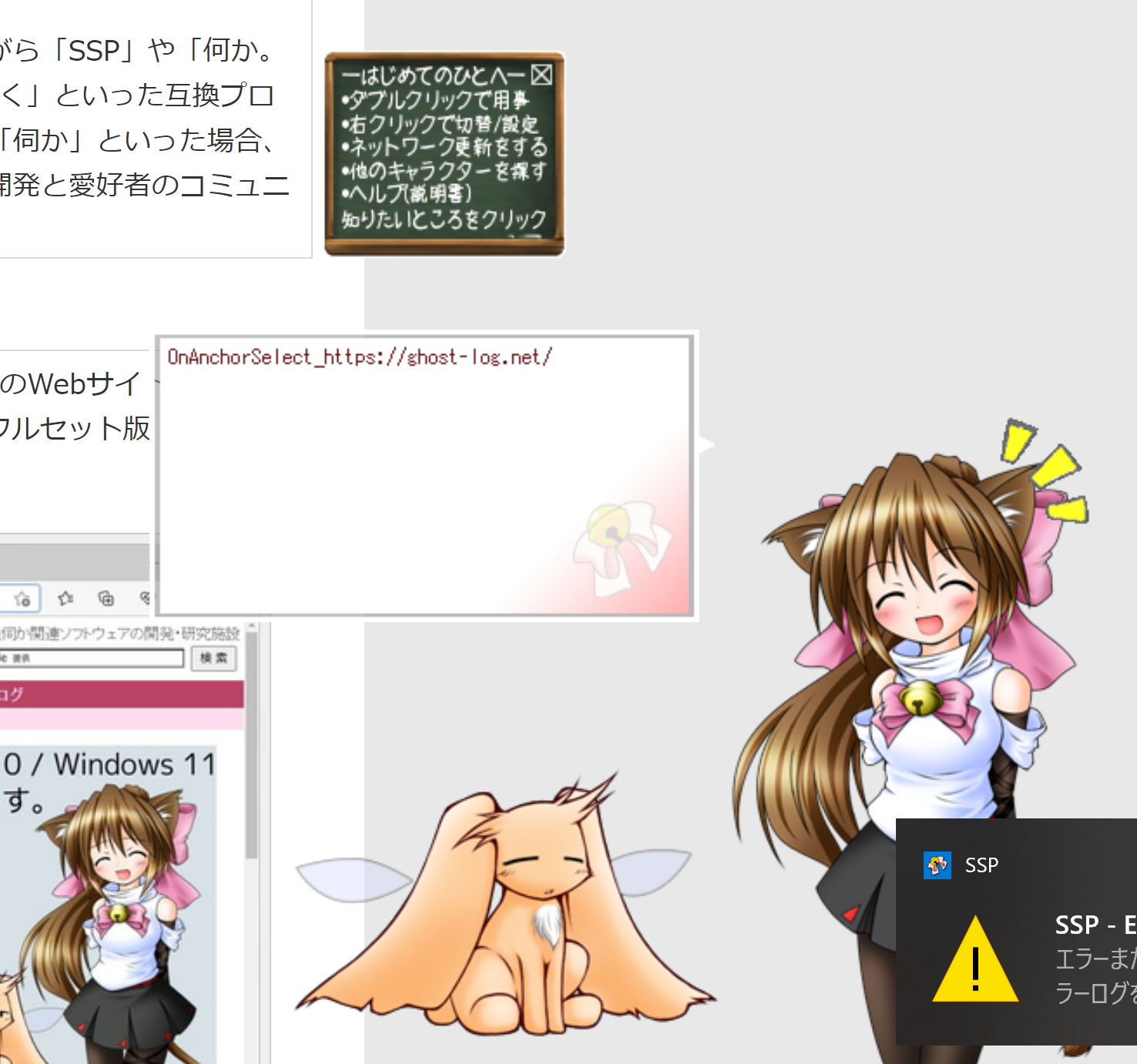 | Description | ゴースト「Emily/Phase4.5」 「はじめてのひとへ」ボードのメニューより 「他のキャラクターを探す」で以下のサイトが紹介されます。 ・ゴーストキャプターさくら ・ghost-log ・GHOST TOWN 「ゴーストキャプターさくら」は「ゴースト」が自動アンカー機能により\_aタグが二重となり機能せず、 「ghost-log」はYAYAのエラーが発生しているようです。 SSP/2.5.90 Windows 10 21H2 | ||||