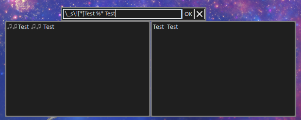 | Description | When running a script such as "\_s\![*]Test", the expected output would be "\![*]Test" in both the \0 balloon and the \1 balloon. But instead, the \0 balloon shows "\![*]\![*]Test", and the \1 balloon shows "Test". This also happens if you specify more characters with \_s[]. For each character specified, the sakura balloon will display an additional \![*]. "\_s[0,1,2,3]\![*]Test" will display "\![*]\![*]\![*]\![*]Test", while every other balloon only displays "Test". This happens for every \![*] or %* that is placed in the script. | ||||