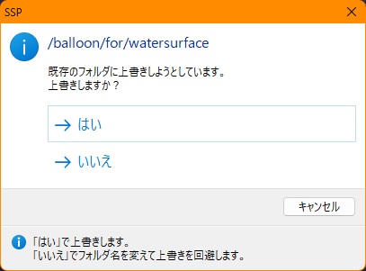 | Description | お疲れ様です 先日Twitterで告知され、整備班ページにて配布されたWater Surface用バルーンの「v2」版なのですが、 フォルダ名が初代のものと同一であるため、インストール時に上書きするかどうかのポップアップが出てきます 初代のバルーンも同時に残しておきたいので、v2版は『b_f_watersurface_v2』と install.txt内にあるフォルダ名の設定を変更していただく事は可能でしょうか? 不具合というわけではありませんので、お暇な時にでもご検討いただければと思います | ||||