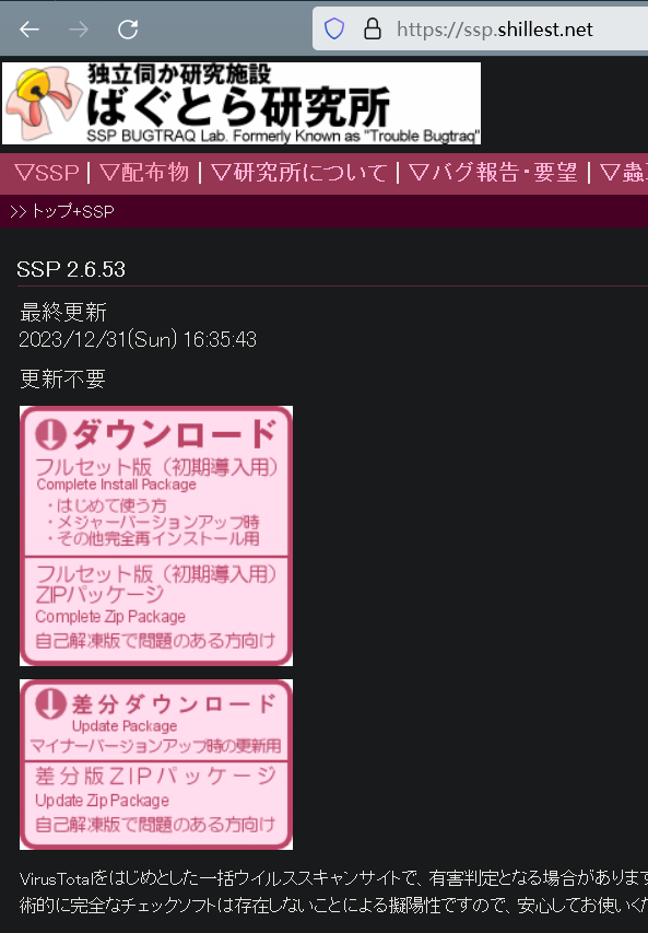 also that spp ver check code with jsstp 3.1.0.1: async function checkSSPVersion() { try { // jsstp.available() の結果をチェックする if (!await jsstp.available()) { document.querySelector(".ssp-current-version").textContent = '(SSPが起動していません)'; return; } const currentVersion = await jsstp.GetShortVersion(); const response = await fetch("/archive/version.json"); const data = await response.json(); let message = ''; if (currentVersion === "") { message = '(SSPが起動していません)'; } else if (currentVersion === data.ssp.full.version) { message = '更新不要'; } else { // バージョン比較ロジックを実装する // ここでは簡略化のため、単純な文字列比較を行っています。 message = currentVersion < data.ssp.full.version ? '更新あり' : '更新不要'; } document.querySelector(".ssp-current-version").textContent = message; } catch (error) { document.querySelector(".ssp-current-version").textContent = '(チェックエラー)'; } } // ページ読み込み時にバージョンチェックを行う document.addEventListener("DOMContentLoaded", checkSSPVersion); |