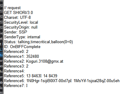 | Description | When Mail Headers are turned off, Reference7 will still contain delimiters when 2 or more eMails are being registered. Tama log example: // request GET SHIORI/3.0 Charset: UTF-8 SecurityLevel: local SecurityOrigin: null Sender: SSP SenderType: internal Status: talking,timecritical,balloon(0=0) ID: OnBIFFComplete Reference0: 2 Reference1: 352480 Reference2: (email censored for spam reasons) Reference3: 2 Reference4: Reference5: 13 846314 8439 Reference6: 1N0Hgr-1sijiB0lXT-00xI7p1MsYif-1sjoaI28qZ-00u5eh Reference7: Image file attached in case text doesn't show up correctly. SSP/2.6.63 (20240409-3; Windows NT 10.0.19045) | ||||
