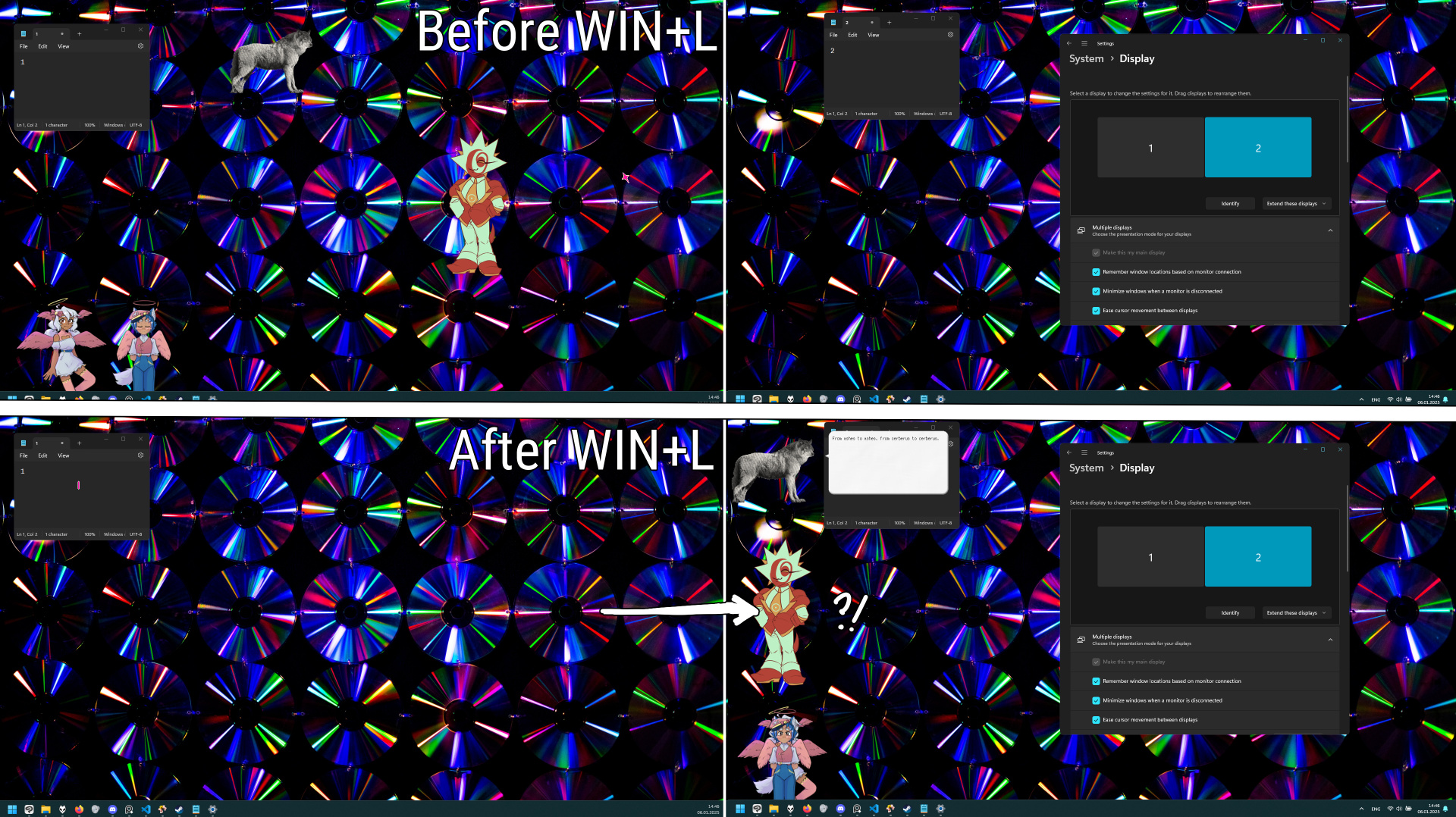 | Description | SSP/2.6.91 (20250104-1; Windows NT 10.0.26100) Whenever logging into the session after computer sleeps, or manually locking session with Win+L, if the ghosts are on the secondary screen (1 on the attached screenshot), they get moved to the primary one (2 on the screenshot). This didn't use to happen until recently. Tried this both in horizontal and vertical positions of the screens, both have the same effect. Confirmed on Windows 10 and 11. Tested on around 6 different ghosts, this seems to happen all of them. | ||||