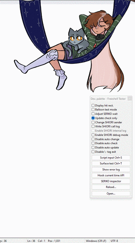 | Description | Tested with the following freeshells: Hammock Buddies: https://whataphantasia.github.io/projects/ukagaka/extra/hammock-buddies kittypunk: https://github.com/SmokyCinnamon/indifferentsorrel/releases/tag/kp_v1.0.0 The shell "Hammock Buddies" specifies a zorder with the kero in front of the sakura. "kittypunk" does not specify a zorder. If you boot a ghost in the "Hammock Buddies" shell, the zorder will work properly. If you boot it in another shell, such as "kittypunk", and then switch to the "Hammock Buddies" shell, the zorder will not work until the ghost is reloaded. Reloading just the shell side doesn't seem to fix the issue. In the attached gif, I have booted the ghost in the "Hammock Buddies" shell, and switch between shells with the ghost explorer. You can see that if I reload the ghost while in the "kittypunk" shell, when I switch back to "Hammock Buddies" the zorder seems to be ignored. If I reload the ghost while in the "Hammock Buddies" shell, it is corrected. SSP/2.6.92 (20250116-0; Windows NT 10.0.26100) | ||||