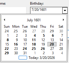 | Description | I opened the birthday selector on a whim and noticed that it was displaying dates in the year 1601. Then I accidentally clicked on the "Today" button, and now I can't set my birthday properly. Every time I open the birthday selector, it displays dates in 1601. If I set it to any other date, it will be reset to a date in 1601 when I open the preferences window again. I also tried manually typing a date instead of picking one in the selector window, and I saw it change the year to 1601 at the moment I closed the preferences window. I tried picking different dates in 1601, and it seems that when I close the preferences window it will often (but not always) pick a different month and day from what I selected, always in the year 1601. Interestingly, if I click on "Today" and then close the SSP preferences window, one of my ghosts will comment about it... and then if I open the preferences window again, the date will be changed to something in 1601, as before. (This ghost uses OnNotifyUserInfo to set a flag if the user's birthday changes to the current date, and says a dialogue when it is possible to do so.) SSP/2.7.82 (20260320-3; Windows NT 10.0.26100) | ||||