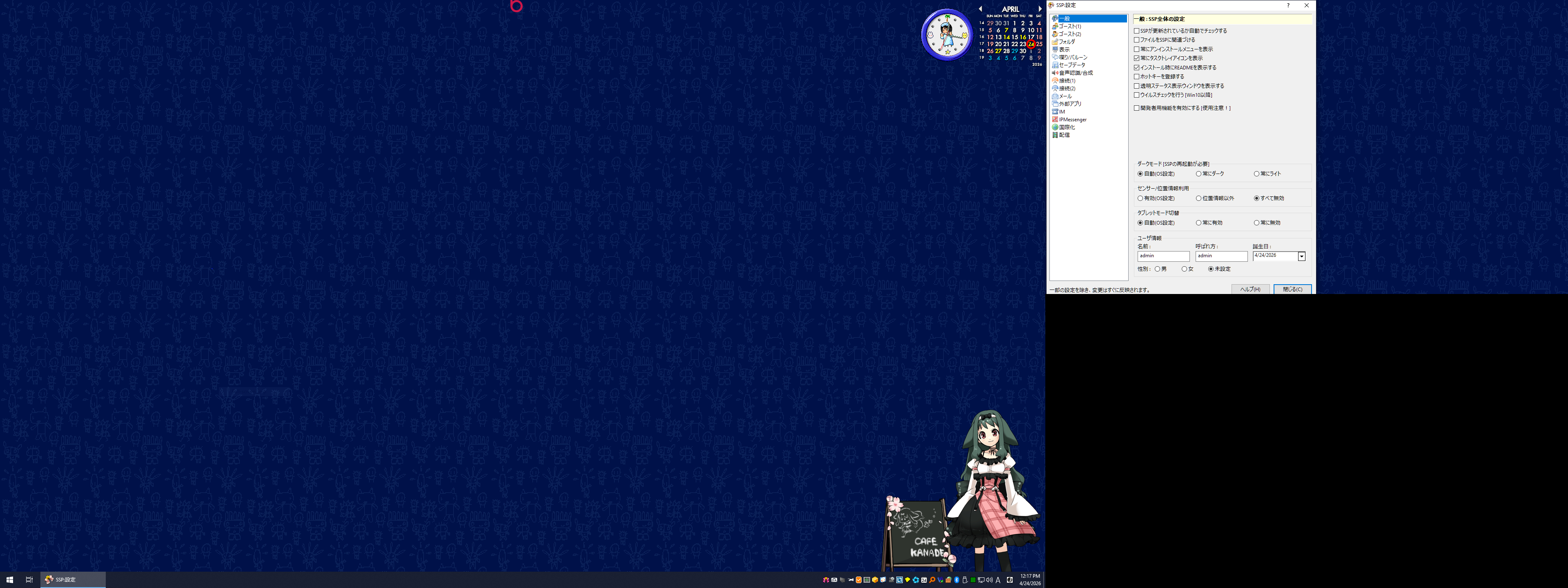 | Description | マルチディスプレイ環境 1/2 Extend で ゴースト右クリック 設定 "本体設定(SSP:設定)"がセカンダリに表示されます。 ssp_2_8_04f.exeをクリーンに展開した状態、またはSSP本体の再起動で再現します。 こちらの環境の都合でセカンダリはHDMI音声出力用の仮想的な空間となっていて、 都度AHKスクリプトで座標を取得してプライマリにウィンドウを移動させてアクセスしています。 そのほかの設定、ゴーストごとの設定やカレンダーなどはプライマリに表示されます。 SSP/2.8.04 (20260422-4; Windows NT 10.0.19045) Windows 10 22H2.7184 (Ver.22H2) Wow64@x64(10.0) [UAC Enabled] Monitor: 0: Work=0,0,2560,1400 Monitor=0,0,2560,1440 BPP=32 DPI=96 [PRIMARY] lDP/hFSgoNT4yGr3MpqGyA== 1: Work=2560,0,3840,720 Monitor=2560,0,3840,720 BPP=32 DPI=96 AV57UY9cvVtnvnMh9TIq5w== | ||||